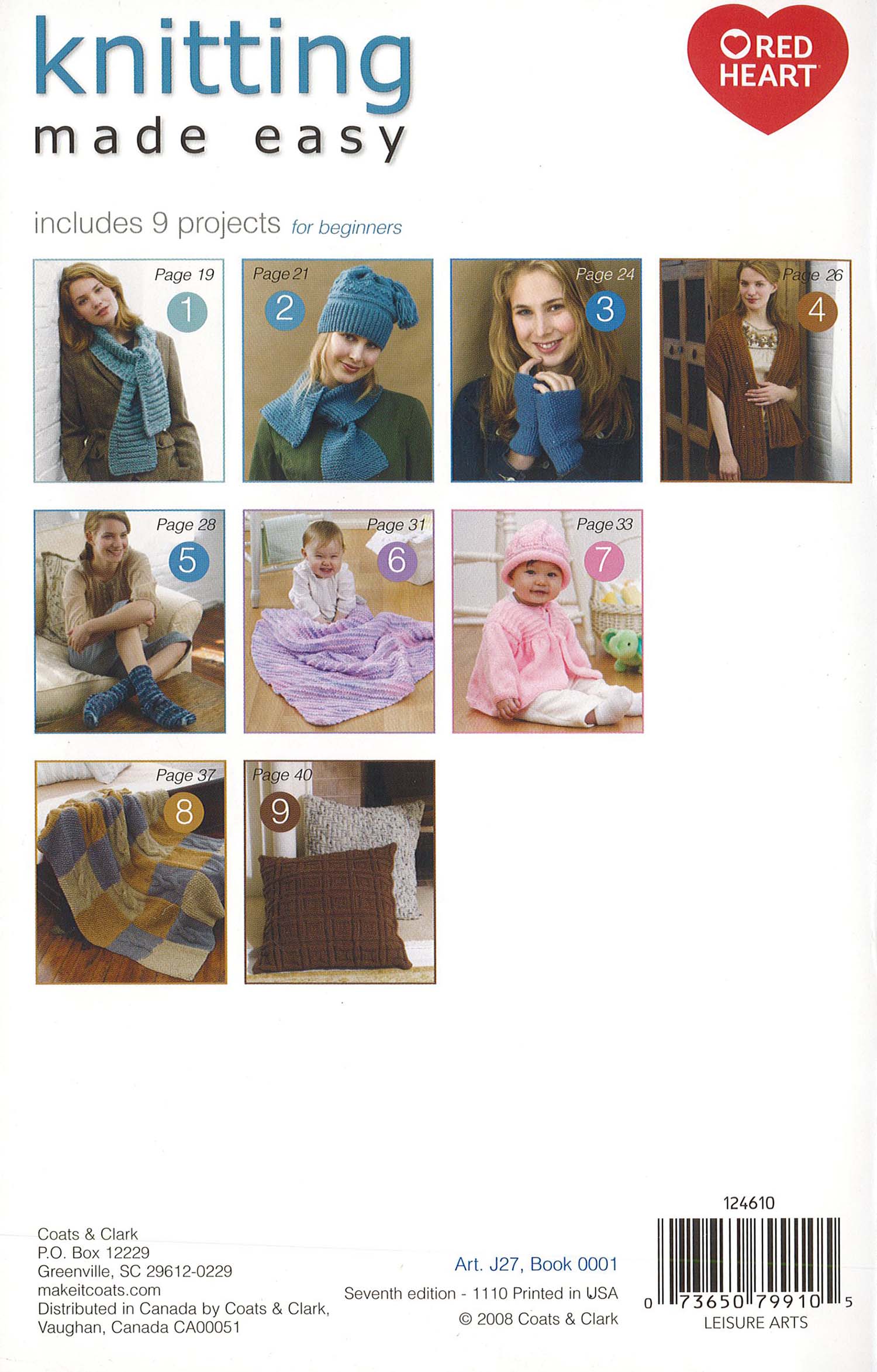 Coats & Clark Knitting Made Easy Book- This book was written for beginners, and features easy-to-understand diagrams and step-by-step instructions to illustrate knitting stitches and techniques. When you have mastered the basic techniques, try the projects included, they're all designed especially for beginners. Projects include: on the double scarf, warm hat & scarf, moss stitch mitts, and more. 40 pages, soft cover.