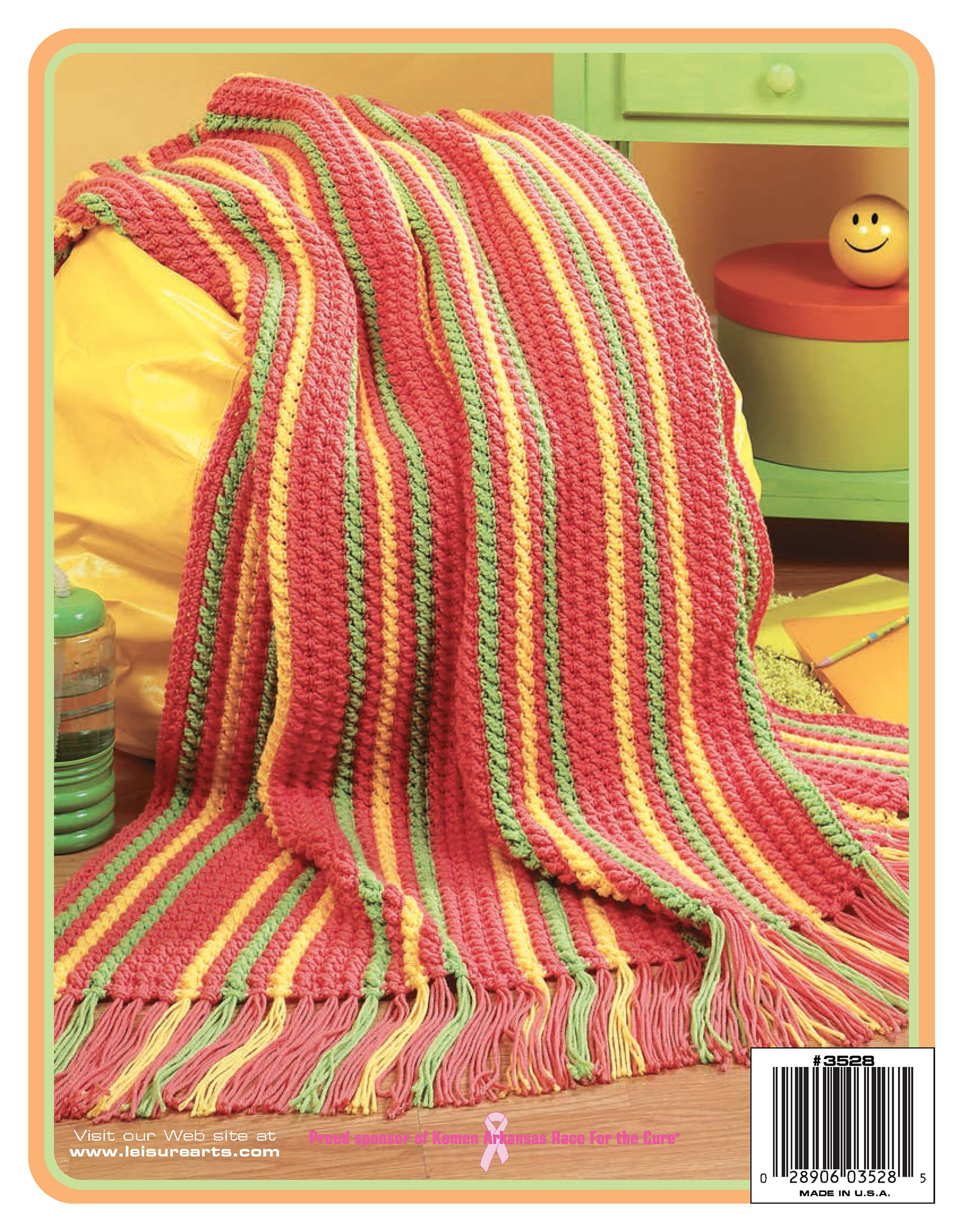 Color Charged Throws- 7 easy crochet designs. Vibrant hues dance across these fresh crochet afghans in the must-have colors of the '70s. These easy-to-make throws are excellent for beginners. Teens and pre-teens will enjoy fashioning any of the color-charged and totally groovy projects. Designs include: oops my nails, beach volley, psychedelic, super diva, so fresh, sugar free, and meeting the parallels. All use worsted weight yarns with US size H or I crochet hooks. 24 pages in a softcover.