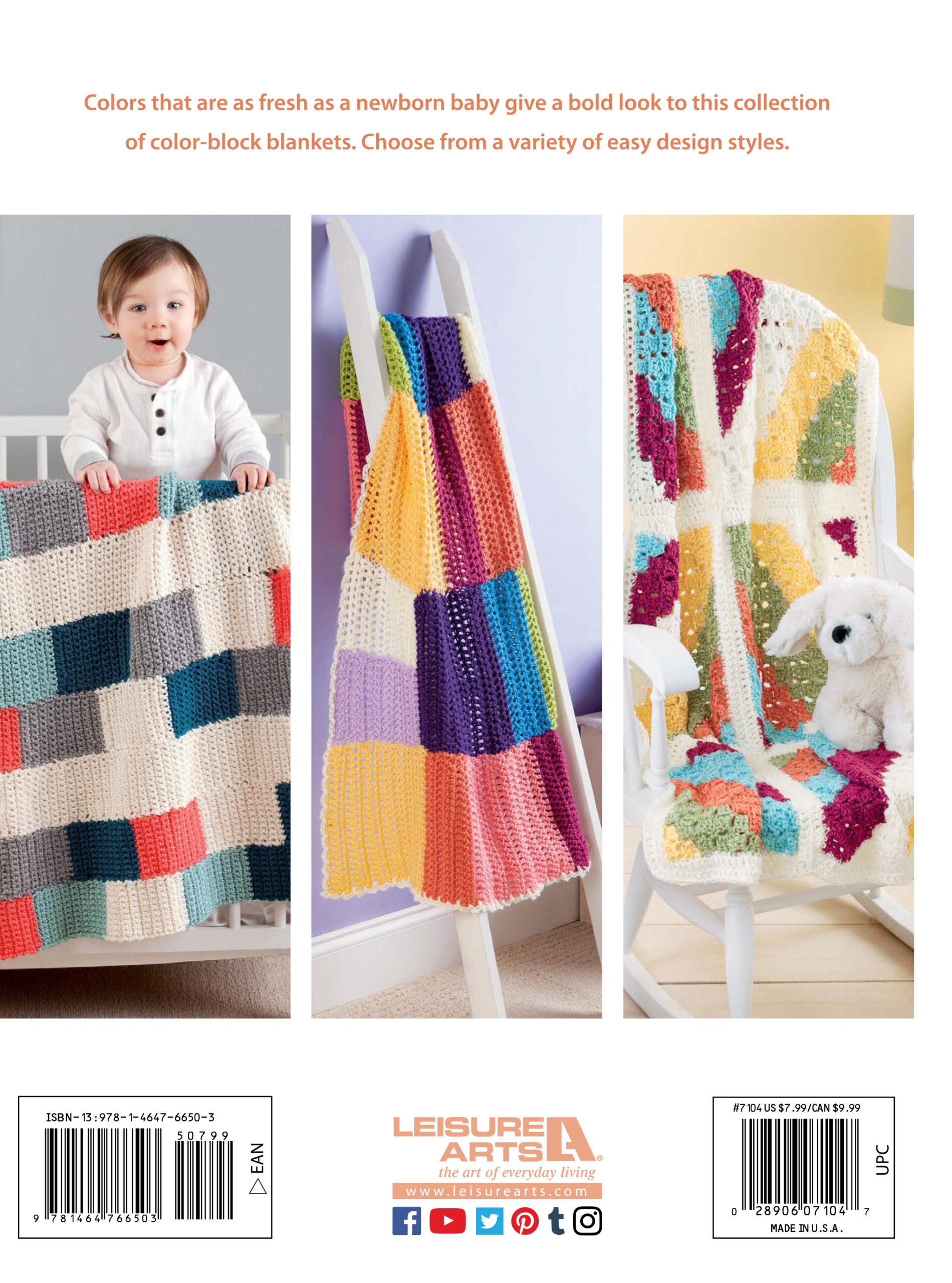 Color Block Baby Blankets Crochet- Colors as fresh as a newborn baby give a bold look to these 6 crochet designs. Match any decor for a bold statement. Choose from a variety of easy styles featuring a mix of stripes, motifs, and other patterns in medium weight yarn. Designs include: color-block rainbow, offset tiles, converging stripes, and more. All patterns are beginner or easy skill level. 24 pages, soft cover.