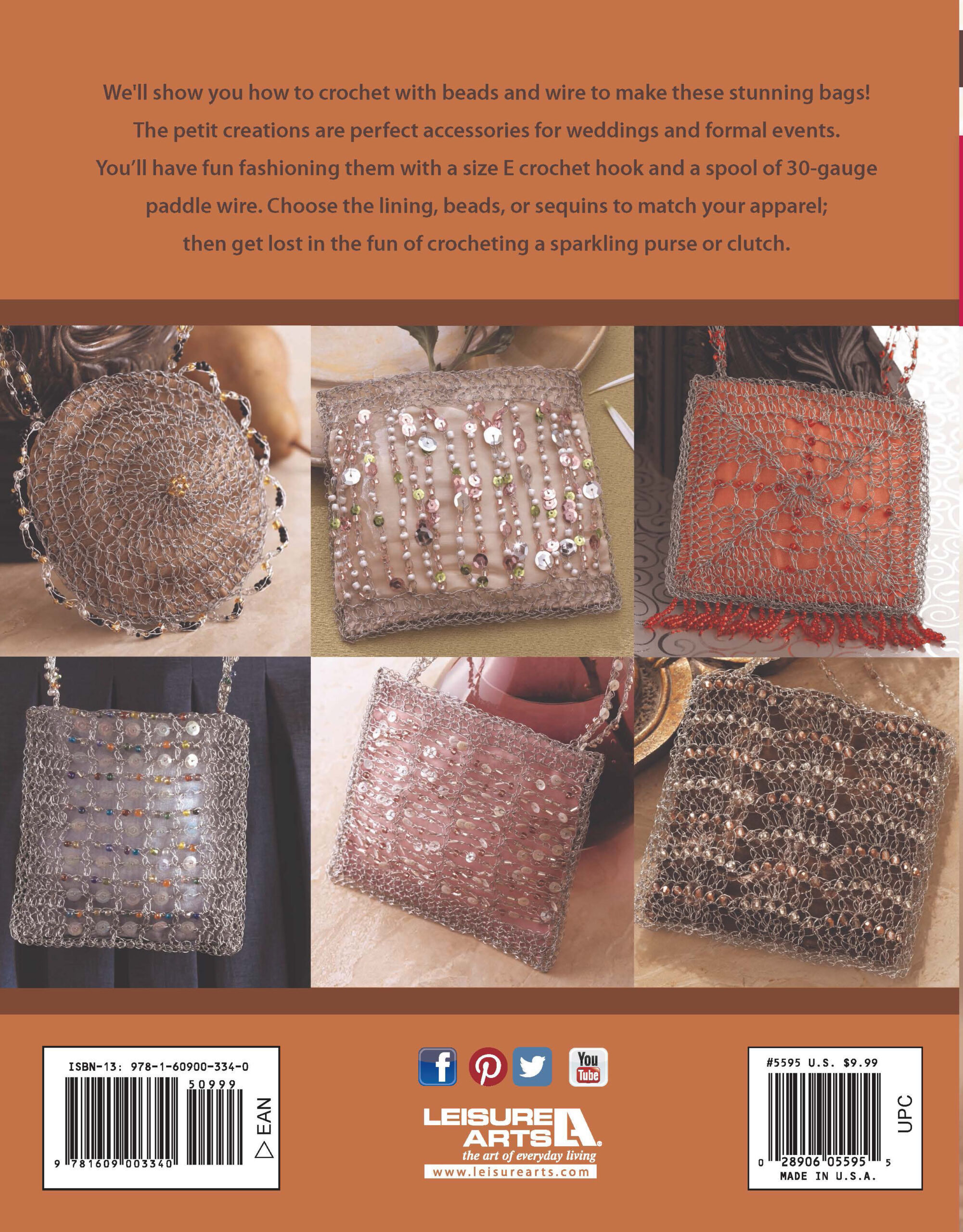 $7.99Leisure Arts Elegant Beaded Bags Crochet eBook- These unique designs combine traditional beading techniques with crochet to create unforgettable bags, totes and clutches. Each design is made by crocheting 30 gauge wire into your desired shape, beading as you go, and sewing up a simple lining to complete the bag. Designs include: bubblegum purse, circle purse, granny's little purse, jellyfish purse, rainbow candies purse, mesh bag and more. Includes row-by-row instructions for each design plus a full guide to techniques with illustrated diagrams. Finished bags measure between approximately 5" and 7" across. Easy skill level. 42 pages, PDF download.