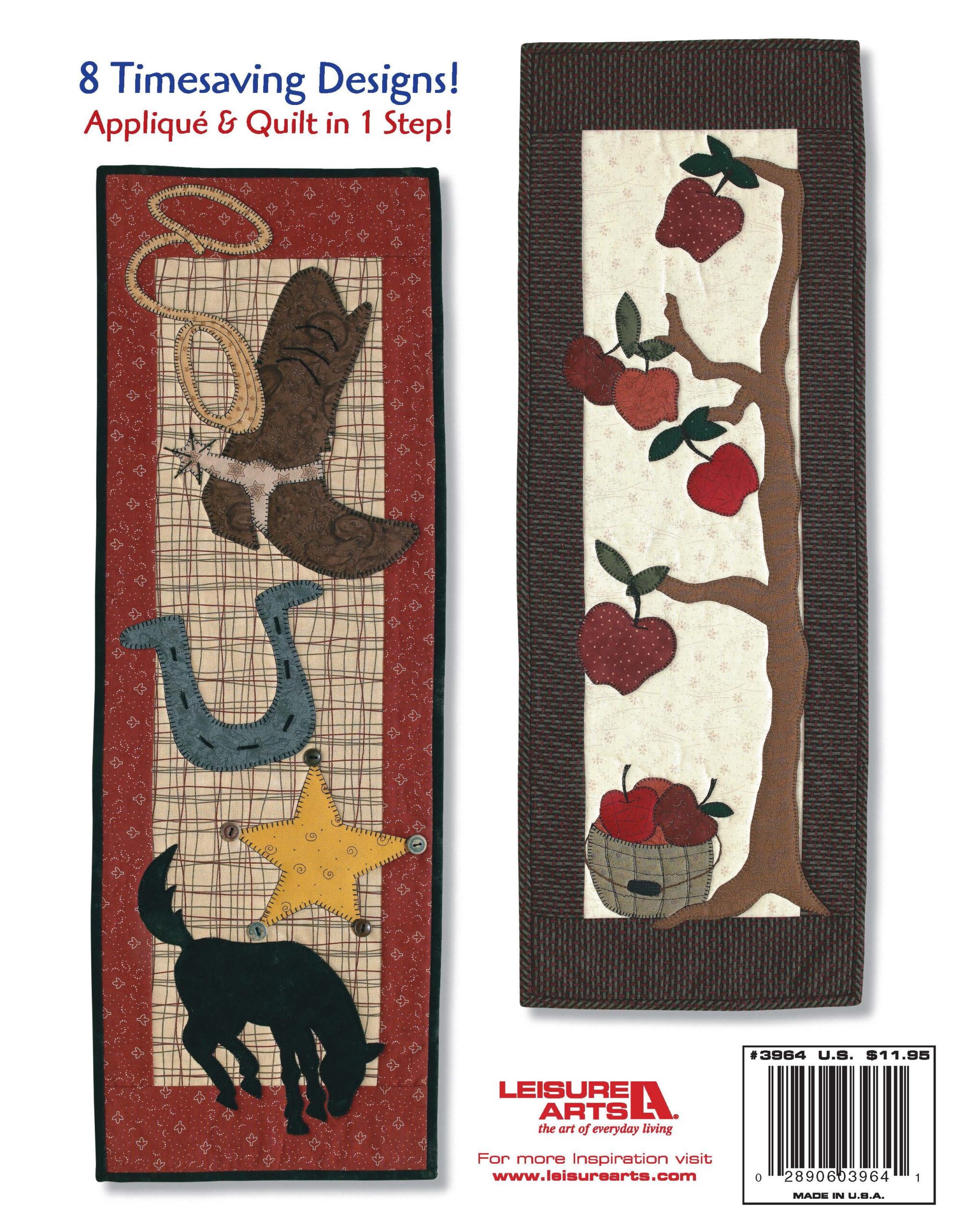 $9.99Leisure Arts Special Occasion Wall Hangings Quilt eBook- 8 quick and easy seasonal wall quilts for every occasion. Designs include: better bushels, autumn blaze, Christmas tree, hot stuff, ride'em cowboy, tools of the trade, and waves of glory. Each wall quilt is construct with a simple center panel of fabric, a thick 4 piece border and its own decorative applique designs. Applique designs include: apples, trees, pumpkins, poinsettias, stars, peppers, horses and much more. Includes step-by-step instructions, diagrams and printable applique templates for each design, as well as a general guide to quilting basics. Finished wall hangings measure approximately 10 1/2"x 29". 54 pages, PDF download.