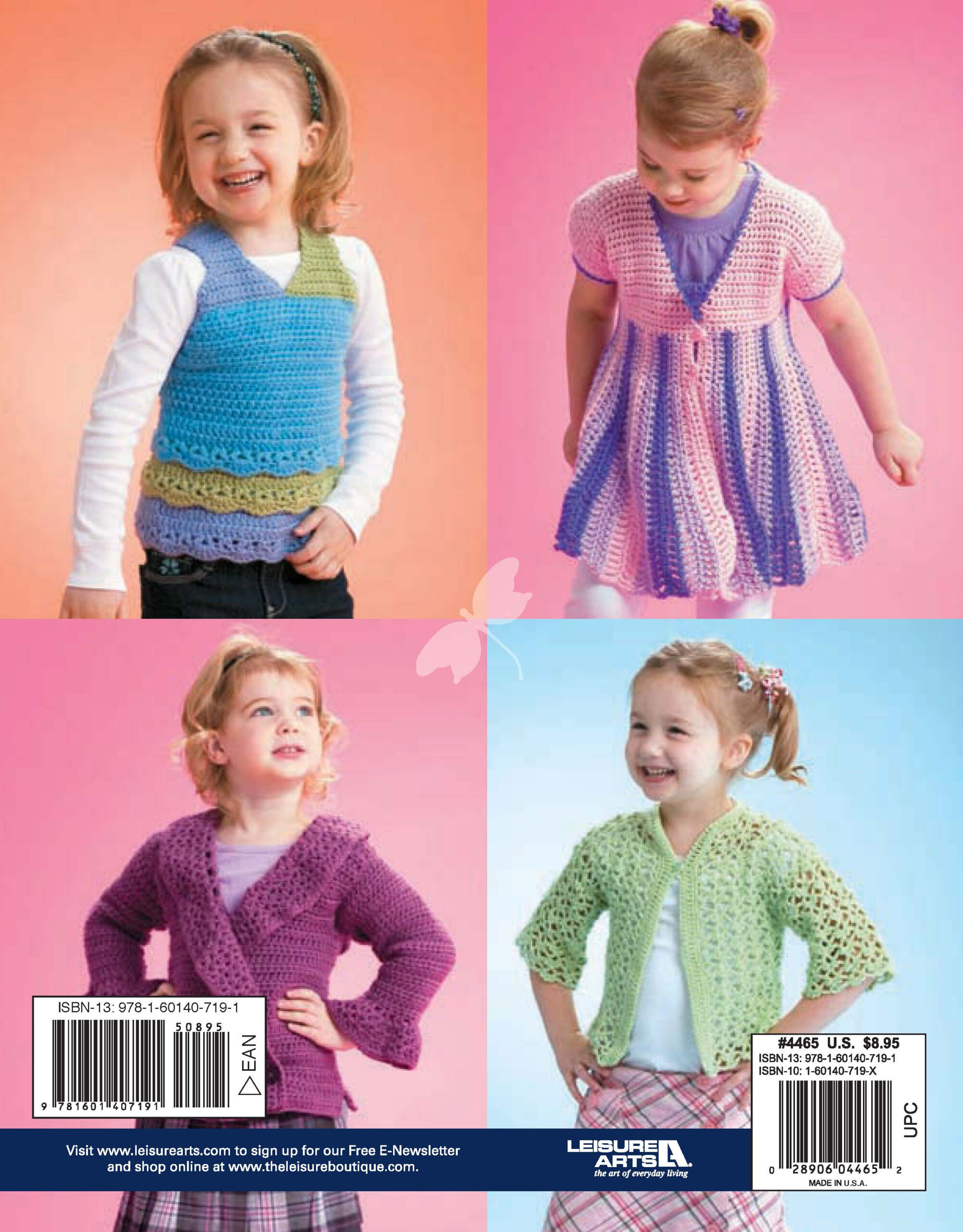 Leisure Arts Top-sy Turvy Crochet eBook- 5 crochet sweaters for girl's sizes 2-10. Created with special features such as multicolor edgings, ruffles, stripes, easy embroidery, and an optional belt, these feminine fashions will go great with your little ladies' wardrobe staples. Designs include: tiered halter, sweetheart sweater, ruffled cardigan, lacy sweater and sassy stripes. Projects call for size 3 light and 4 worsted weight yarns and crochet hooks in US sizes F-5 and G-6. Includes step-by-step instructions for each size, stitch guides diagrams and full color photos for each design. Sizing options fit chests ranging between approximately 18" to 30 1/2". Intermediate skill level. 30 pages, PDF download.