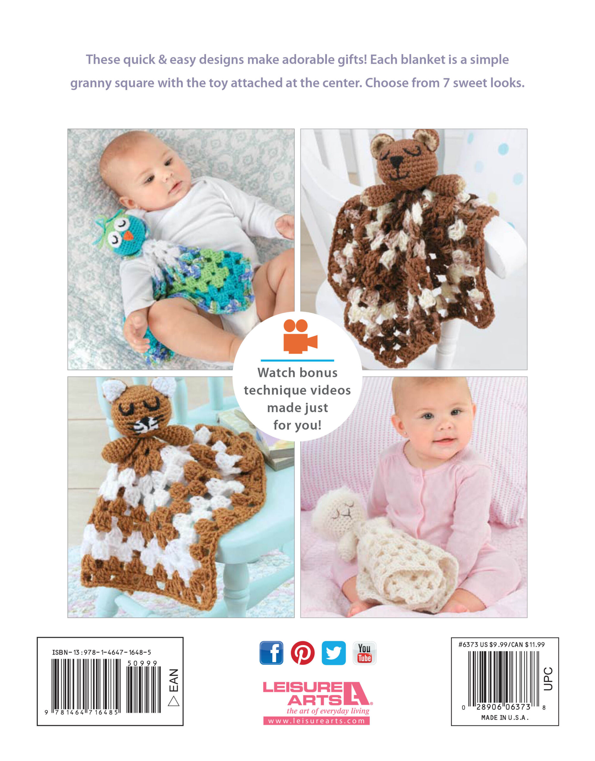 Animal Lovie Blanketss- Give your baby a little friend to cuddle and take everywhere they go. These quick and easy crochet designs make adorable baby gifts. Cute, fun, and loved by everyone who sees them, each blanket is a simple granny square with the toy attached at the center. Yolanda Soto-Lopez designs include: kitty, lamb, panda, and more. Beginner skill level with general crochet instructions and diagrams. All designs require US size 4 medium weight yarn and one each of size F-5, 3 3/4 millimeter, and J-10, 6 millimeter, hooks. Finished size measures approximately 13 1/2" tall. 32 pages, soft cover.