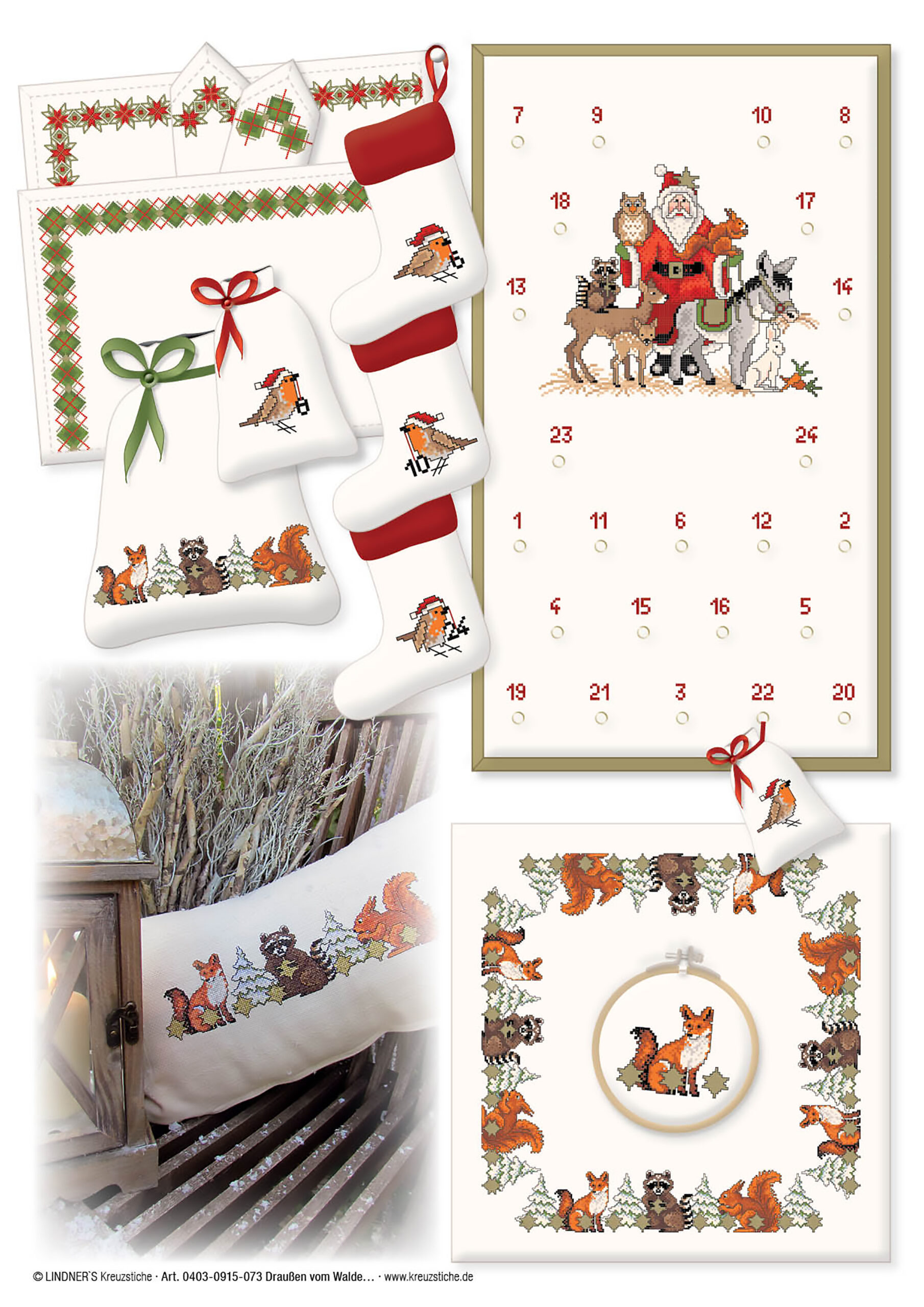 $7.99Lindner's Cross Stitch Charts feature classic embroidery themes and motifs reimagined by German designers Michael and Gudrun Lindner. All design charts are full-color counted cross stitch. Use these chart designs to add a decorative touch to curtains, table linens, kitchen towels, pillows and much more. Out Of The Woods ePattern- Includes an assortment of natural Christmas motifs like: Santa Claus, owls, squirrels, birds in Santa hats, foxes, raccoons, a snowy landscape and more. Large border designs feature larger versions of the snowy landscape with Santa and his reindeer, and a repeatable row of foxes and raccoons. Largest design measures approximately 51 x 251 stitches. Stitch each motif individually or combine them for a custom look. Includes a page with embroidery tips and tricks, illustrated stitch guides, color recommendations and general instructions in several languages. Additionally includes a chart with numbers 1-9 so that you can create your own advent calendar. 5 pages, PDF download.