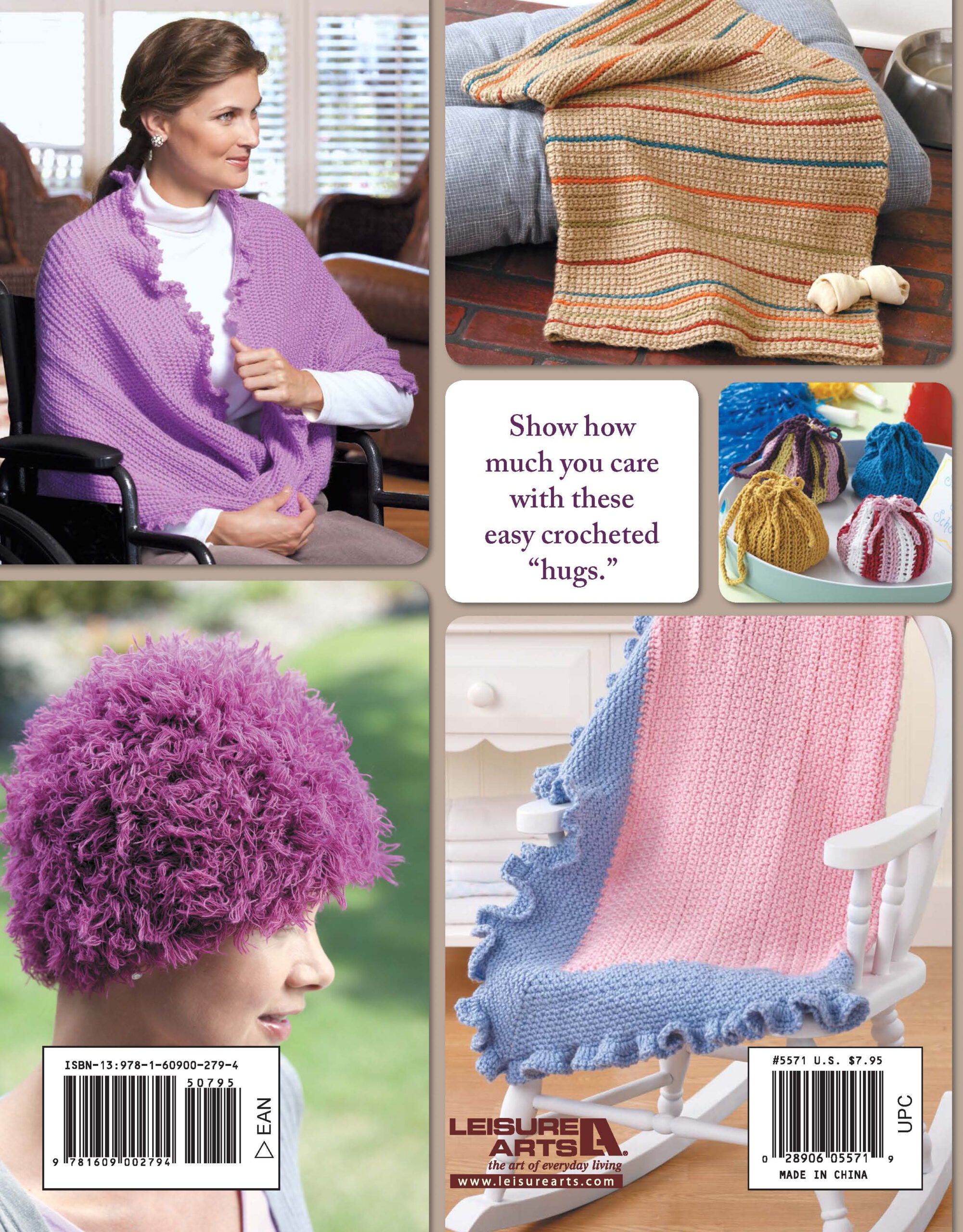 $7.95Hug It Out Crochet- 9 crochet designs to offer comfort. Crocheted with love, a warm wrap, or a plump teddy bear can be just the hug someone needs. The motion of stitching and working with yarn is wonderful therapy for the crocheter as well. Designs include mobius cowl, chemo cap, baby comfort blanket, kennel blanket, baby hat, comfortghan, prayer shawl, comfort teddy bear, and drawstring bag. Projects call for a wide variety of yarn weights and crochet hooks ranging between US sizes D-3 and K-10 1/2. Includes step-by-step instructions for each design, a general guide to crochet, and a contact list of national groups that distribute crocheted donations. Easy to Intermediate skill level. 28 pages in a softcover.