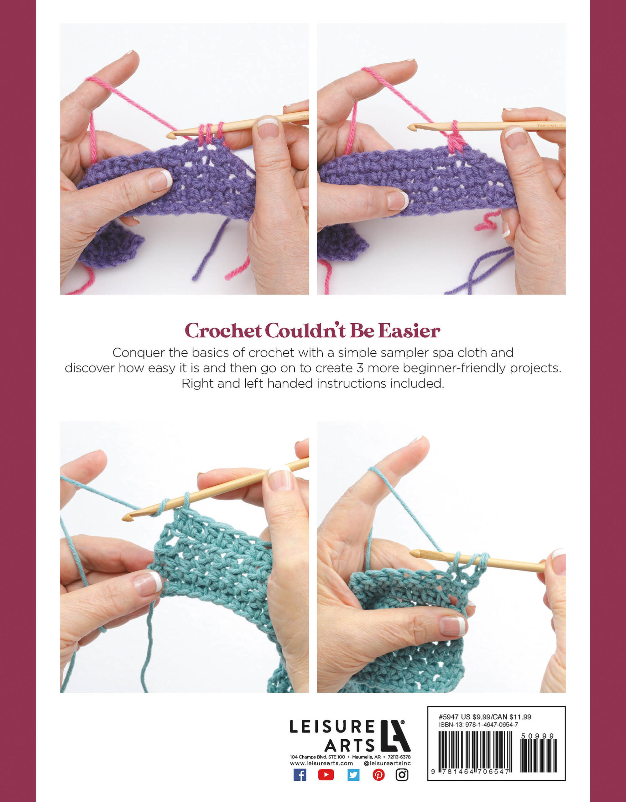 Learn To Crochet Now- Conquer the basics of crochet with a simple sampler spa cloth. Then discover how easy it is to go on to create 3 more beginner-friendly projects. With step-by-step explanations covering how to hold your hook, identifying stitches, how to read patterns, and finishing techniques. Includes both right and left handed instructions for chain, single, double, half double and treble crochet. Uses size 4 worsted weight yarn and hook sizes H, I and K. 36 pages in a softcover.