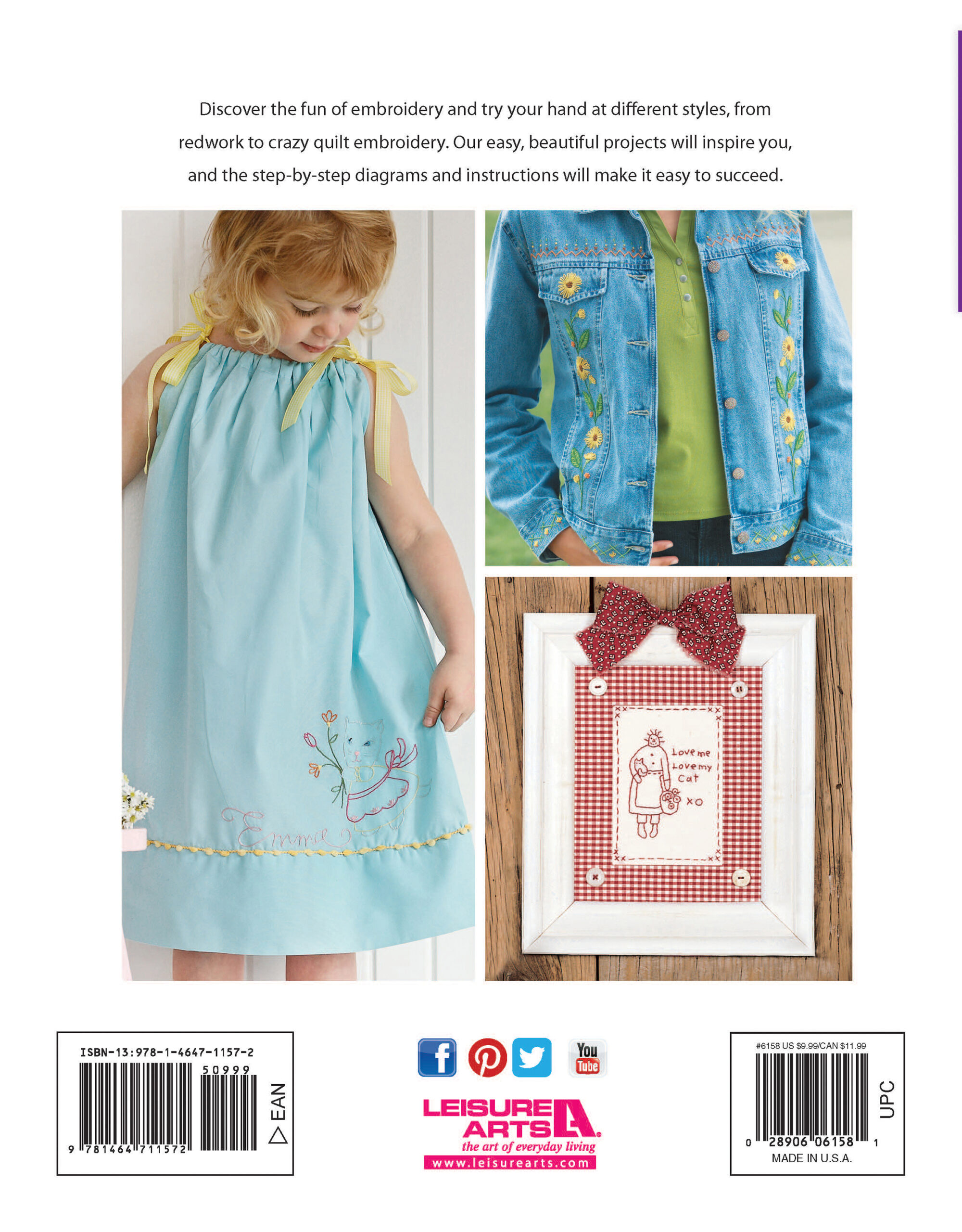 Learn To Embroidery With The Best Of Leisure Arts- Discover the fun of embroidery and try your hand at different styles, from redwork to crazy quilt stitches. These easy beautiful projects will inspire you and the step-by-step diagrams will make it easy to succeed. The techniques are easy, and the designs progressively ramp up in difficulty, so there's something for every skill level. Designs include: jacket embellishment, apron trim, pillows, monogramming, and more. Beginner skill level. 32 pages, softcover.