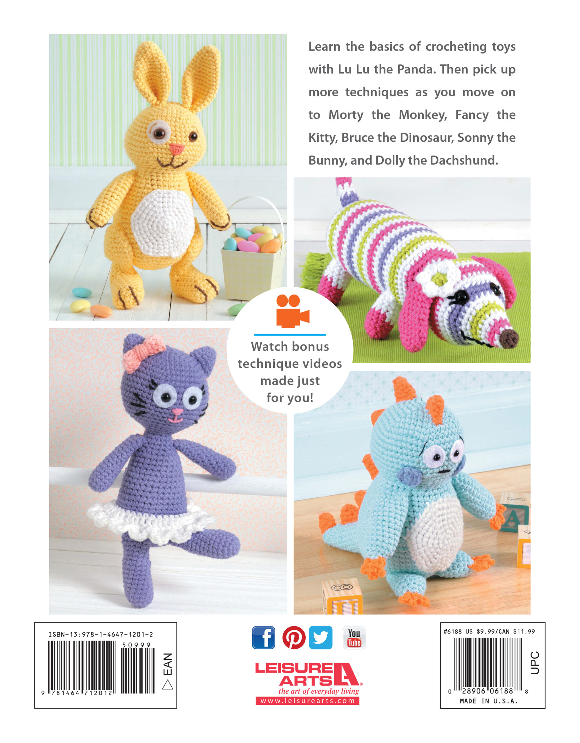 Learn To Crochet Toys- Reflecting the popular style of Japanese amigurumi, these little stuffed animals made fun toys or collectibles for any crocheter. With in-depth, beginner-friendly instructions anyone can learn to make these adorable friends. Learn the standard stitches and techniques with the first design, Lu Lu the Panda, and then pick up new skills with each additional project. Designs include: Morty the monkey, Fancy the kitty, Bruce the dinosaur, Sonny the bunny, and Dolly the dachshund. Each project uses size 4 medium weight yarn and US size F crochet hook. Finished toys measure approximately 7 1/2" to 14" tall. Beginner to intermediate skill level. 32 pages in a softcover.
