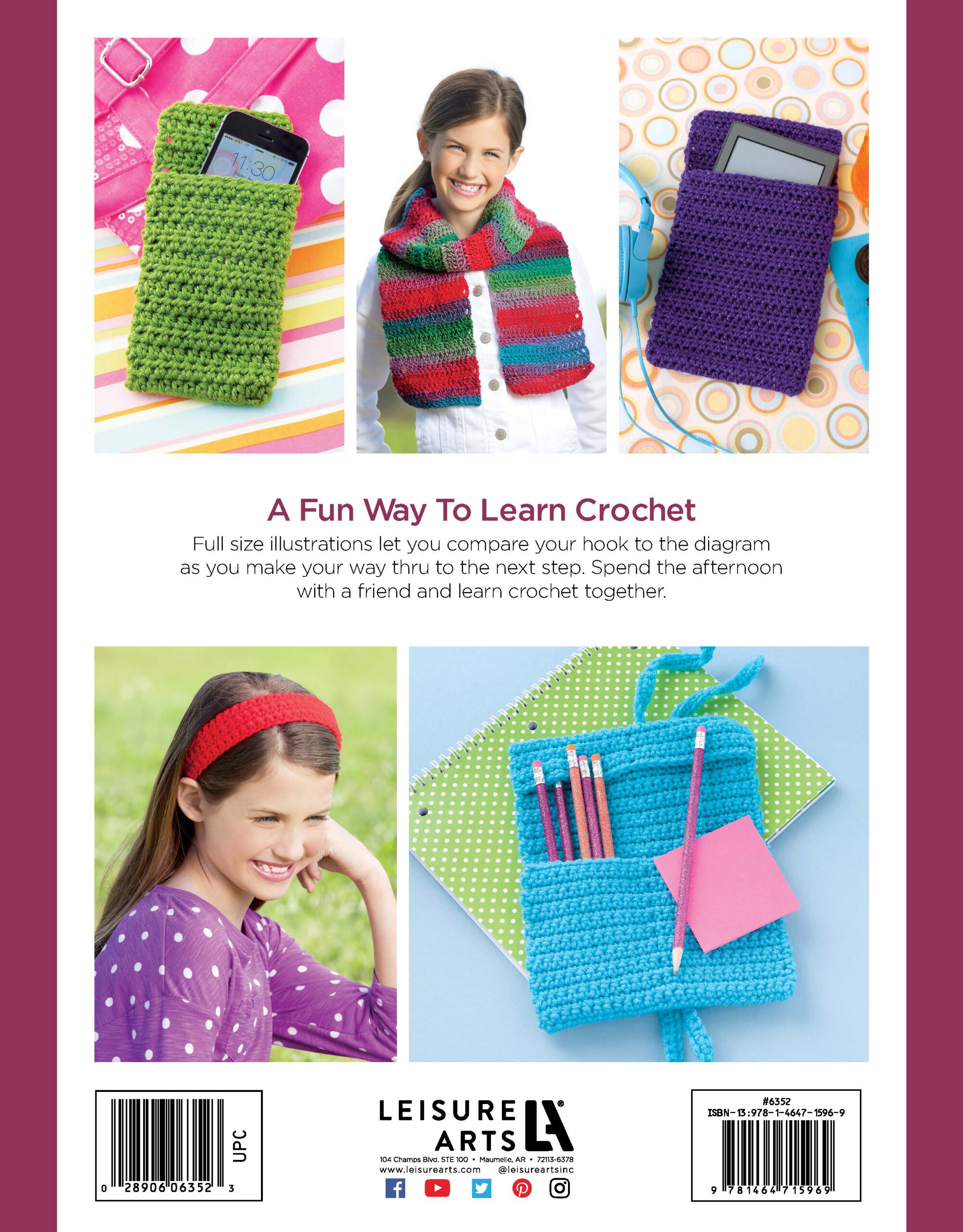 Learn To Crochet For Kids- Introduce your kids to the art of crochet. Designs created by Jean Leinhauser and Rita Weiss. Includes basic instructions, techniques, and stitches, this will be their gateway to crafting. For each crochet stitch or technique, an actual-size drawing is presented so that the work can be placed on the drawing to be sure that what's done is correct. Kid-friendly explanations and instructions accompany the illustrations for 5 different designs. Acquiring a new skill will be fulfilling and fun. Designs include: headband, cell phone sack, tablet cover, scarf, and pencil holder. 32 pages in a softcover.