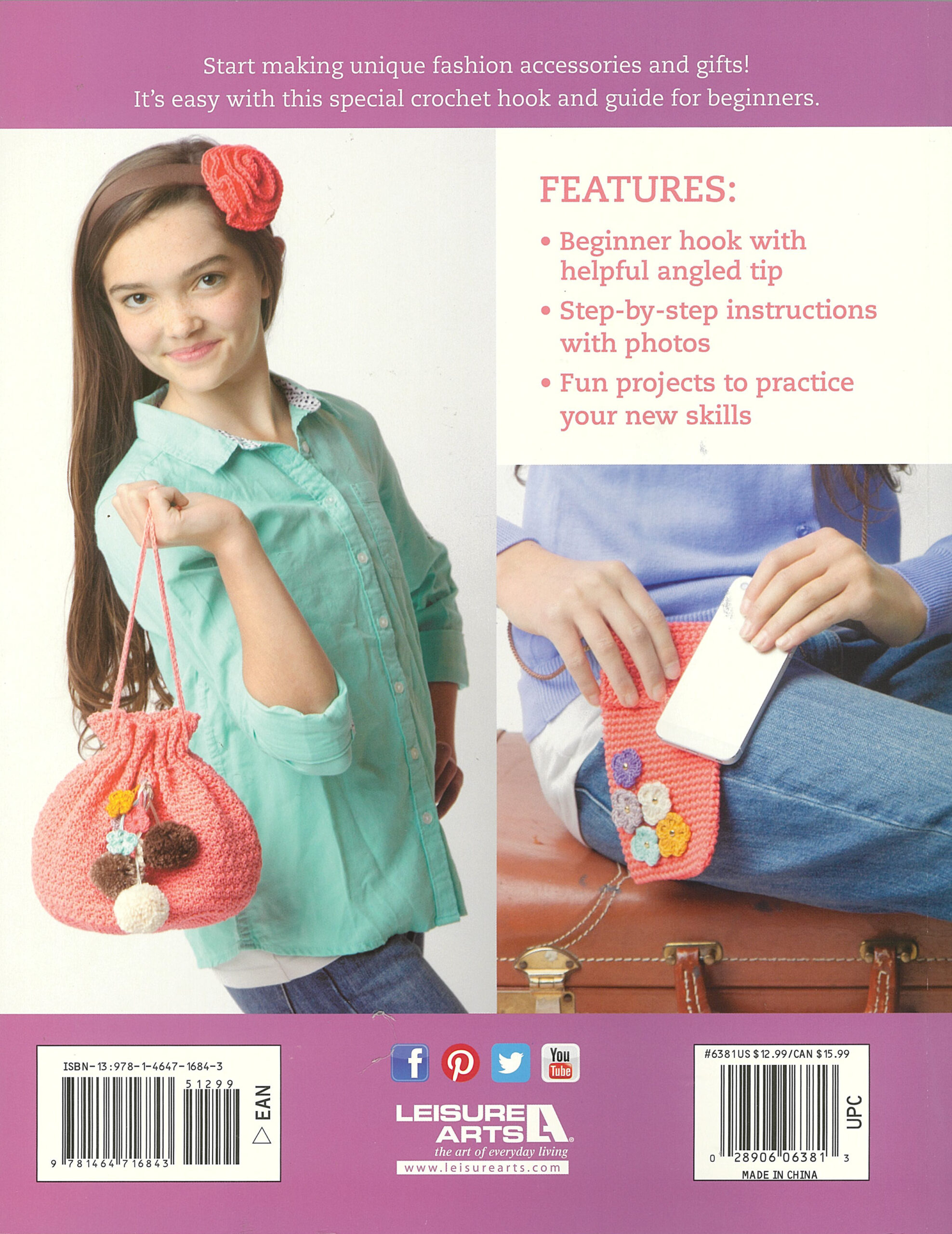 Learn To Crochet with Custom Hook- A special crochet hook makes it extra easy to learn crochet. The unique angled point allows the hook to easily slip into the stitches. Start from scratch with this beginners crochet and hook. 3.5mm hook is easy to use, while step-by-step instructions give you the chance to make 7 different pieces for your wardrobe. Designs include: necklaces, headbands, drawstring bag, phone sleeve, and neck cuff cowl. Recommended size 3 light weight yarn in a bright color that makes it easier to see the stitches. 48 pages in a softcover.